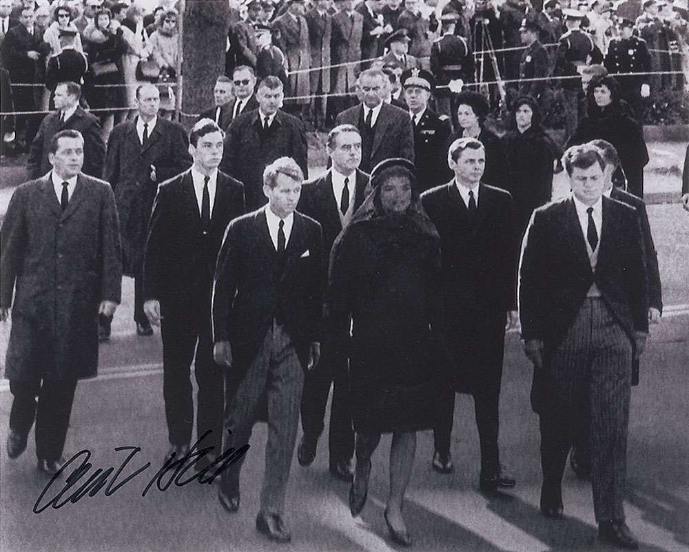 Satin-finish 10 x 8 photo of Hill walking alongside Jacqueline, Robert, and Ted Kennedy during John F. Kennedy’s funeral, signed in black felt tip. In fine condition. RRAuction COA.