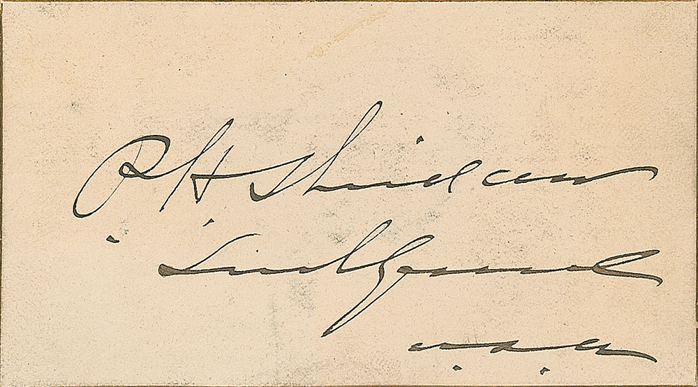Ink signature, “P. H. Sheridan, Lieut. General, U. S. A.,” on an off-white 3.5 x 2 gilt-edged card. In very good condition, with a couple noticeable creases, scattered soiling, and mounting remnants to reverse from previous display in a scrapbook. RRAuction COA.