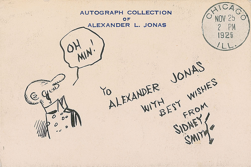 Original vintage ink sketch of his Gump character saying, “Oh Min!” on an off-white 4.5 x 3 custom-made collector’s card, signed and inscribed, “To Alexander Jonas, with best wishes, from Sidney Smith,” with a clipped November 25, 1925, Chicago, Illinois, postmark affixed to upper right corner. In fine condition, with mild overall toning and mounting remnants to reverse from previous display in a scrapbook. RRAuction COA.