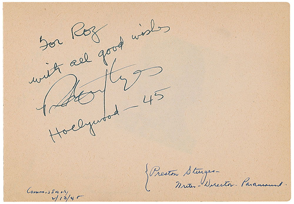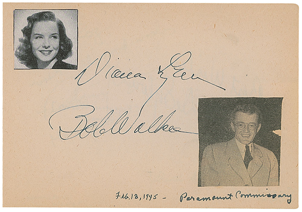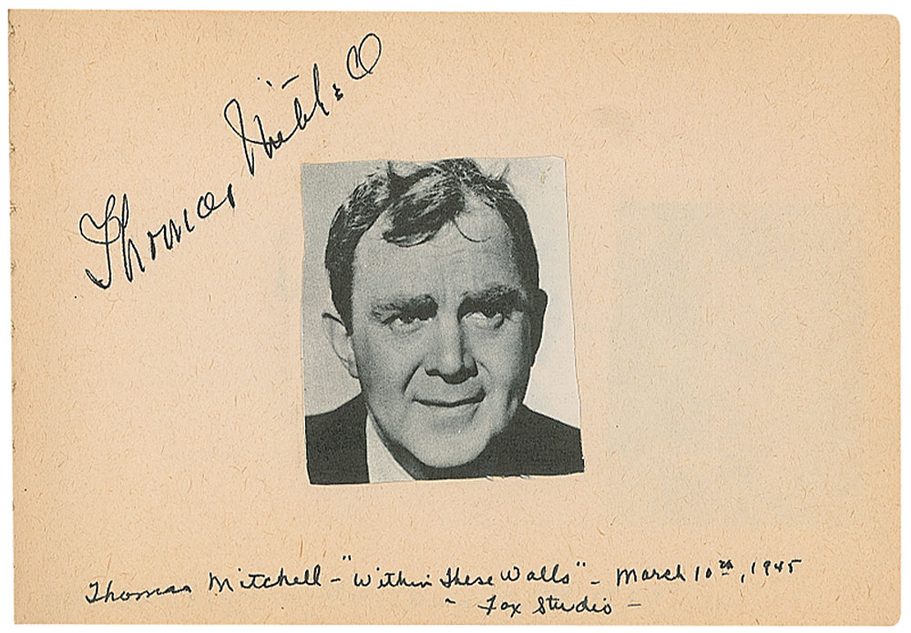 Vintage hardcover 6 x 4.5 autograph album, signed inside in fountain pen by 33 actors, actresses, and executives, almost all single page, a few back-to-back signatures, some inscribed, and some signatures on affixed cards and slips as well. Signers include: Spencer Tracy, Thomas Mitchell, Robert Walker, Preston Sturges, Shirley Temple, Alan Ladd, George Jessel, William Bendix, Phil Silvers, Patric Knowles, Dorothy Lamour, Ray Milland, Sonny Tufts, Betty Hutton, Pat O’Brien, Edgar Bergen, Carmen Miranda, Gene Tierney, Deanna Durbin, and Eugene Pallette. Most of the pages also bear collector’s notations and small clipped photos. In fine condition, with loose binding and expected handling wear. RRAuction COA.