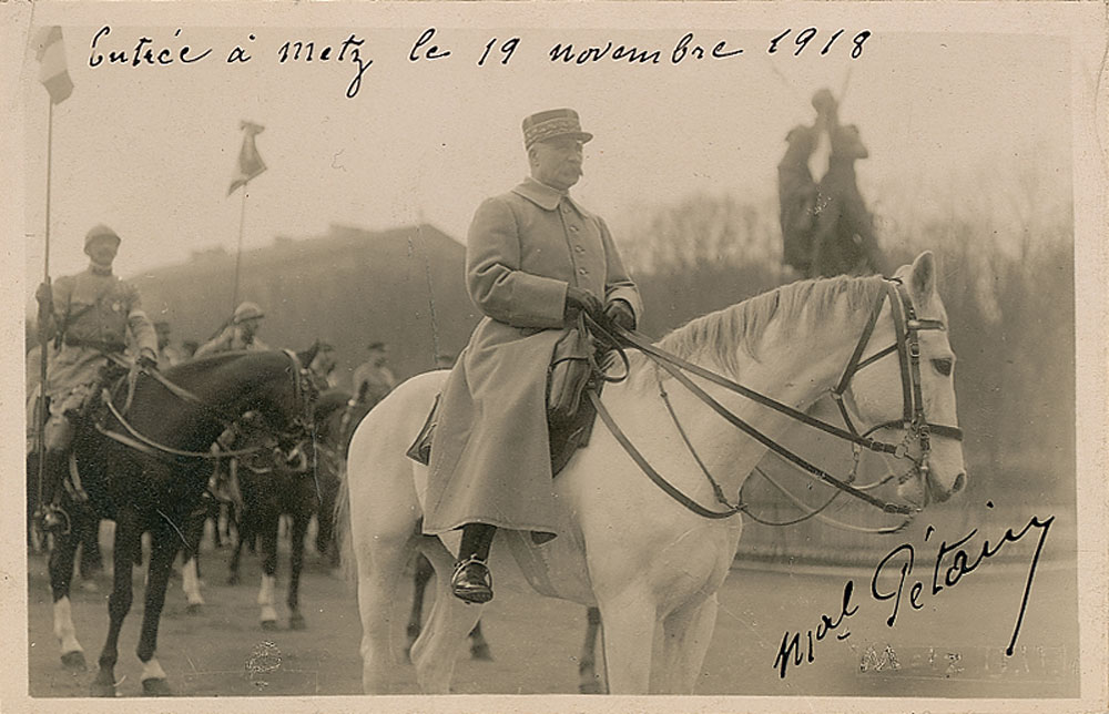 French general (1856–1951) who was honored as a national hero for his defense of Verdun during World War I, but who was convicted after World War II of dealings with the enemy while head of the collaborationist Vichy regime. Vintage 5.5 x 3.5 postcard photo of Petain on horseback, signed in fountain pen, “Mal Petain,” adding a line in French at the top which translates to “Entry into Metz November 19, 1918.” Scattered creases to lower portion of image and a bit of light silvering to darker areas of background, otherwise fine condition. RRAuction COA.