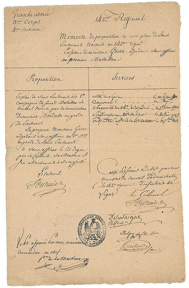 French soldier and military commander during the French Revolutionary Wars and the Napoleonic Wars (1769–1815). He was one of the original 18 marshals of France created by Napoleon. Handwritten endorsement, in French, “Seen and approved by us, Marshal Commander-in-Chief Prince of the Moskowa,” on a one-page 9 x 14.25 manuscript DS from Colonel Sournier of the l43rd Regiment naming non-commissioned officer Gorre a second Lieutenant. Endorsed at the bottom by Ney and also signed by two others. Central horizontal and vertical folds, a uniform shade of toning, and scattered light creases and wrinkles, otherwise fine condition. RRAuction COA.