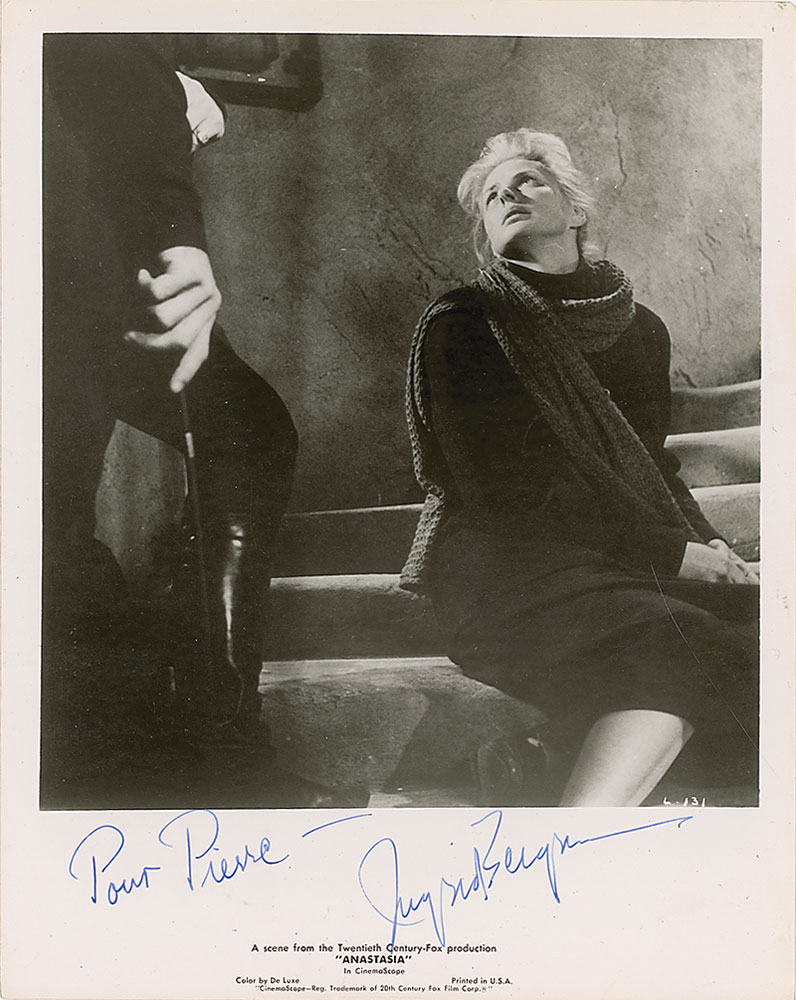 Glossy 8 x 10 20th Century Fox promotional photo for Anastasia, signed and inscribed in the lower border in fountain pen, “Pour Pierre—Ingrid Bergman.” In fine condition, with mild scattered surface bends and creases. Pre-certified PSA/DNA and RR Auction COA.
