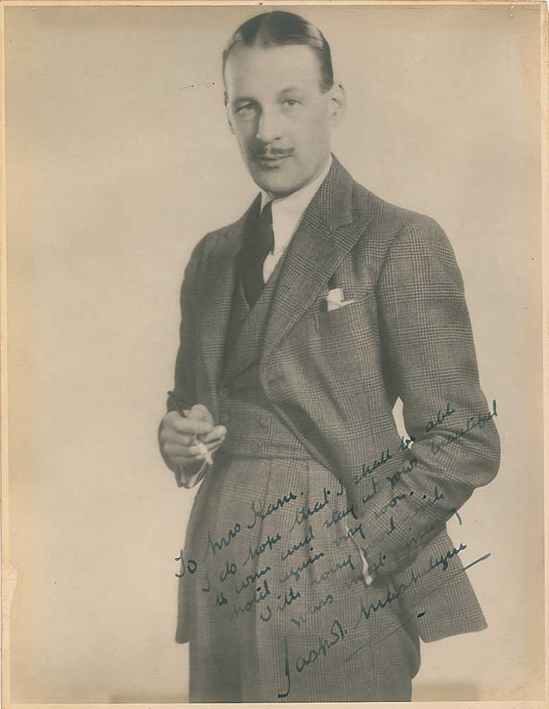 British stage magician (1902–1973) most remembered for the accounts of his work for British military intelligence during WWII, creating large-scale ruses, deception, and camouflage. Vintage matte-finish 7.5 x 9.75 photo, signed and inscribed in fountain pen “To Mrs. Ham, I do hope that I shall be able to come and stay at your beautiful hotel again very soon. With every good wish, yours most sincerely, Jasper Maskelyne.” In very good condition, with toning to the borders, a few tack holes to the top, light surface loss to the left border, a crease to the lower right corner, and lightly trimmed edges. Pre-certified PSA/DNA and RR Auction COA.