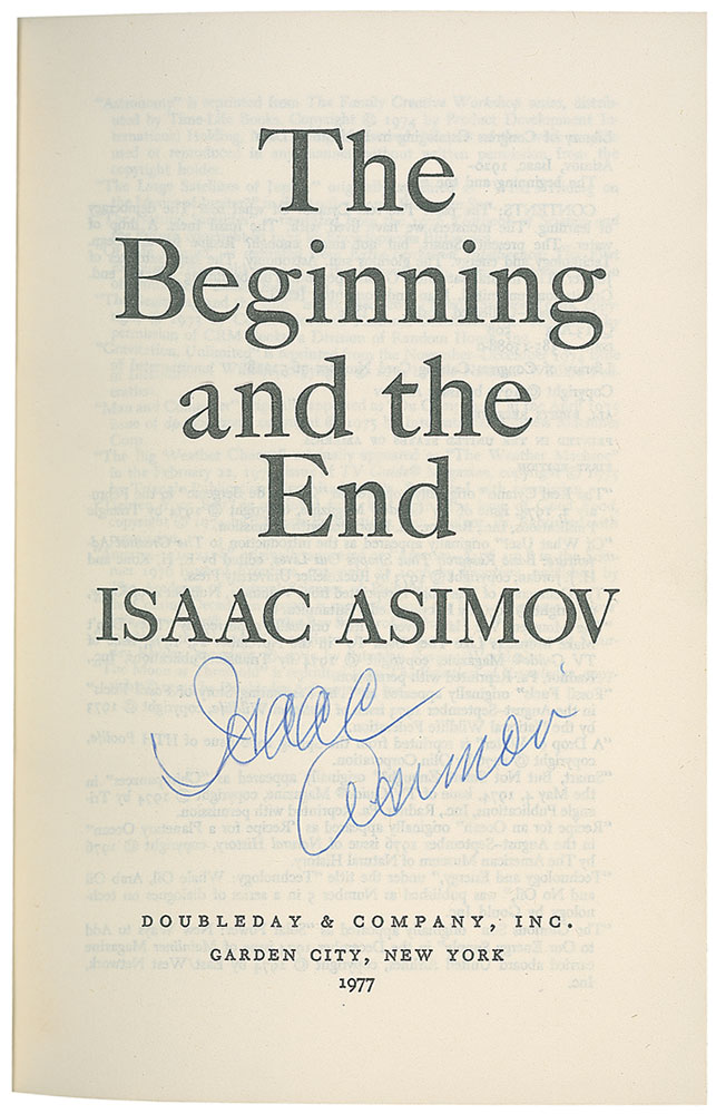 Signed book: The Beginning and the End. First edition. NY: Doubleday, 1977. Hardcover with dust jacket, 5.75 x 8.5, 248 pages. Signed on the title page in blue ballpoint. In fine condition, with scattered creases and light tears to dustjacket. RRAuction COA.