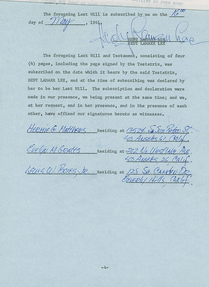 DS, signed “Hedy Lamarr Lee,” four pages, 8.5 x 13, May 16, 1961. Last will and testament of Hedy Lamarr. In part: “I, Hedy Lamarr Lee,…declare this to be my Last Will…I hereby declare that I am a divorced woman and that I have two children of a prior marriage…Denise Hedwig Loder…and Anthony John Loder…I give, devise and bequeath absolutely and in fee simple all of the real and personal property…to my two children…in equal parts…I have intentionally omitted all of my heirs who are not specifically mentioned herein and in this connection I specifically exclude James Markey, also known as James Lamarr, also known as James Lamarr Loder…includes exclusion of any child or children…of the said James Markey…and I hereby generally and specifically disinherit each, any and all persons…as mentioned in this Last Will.” Document is still stapled into its original legal folder. In fine condition.