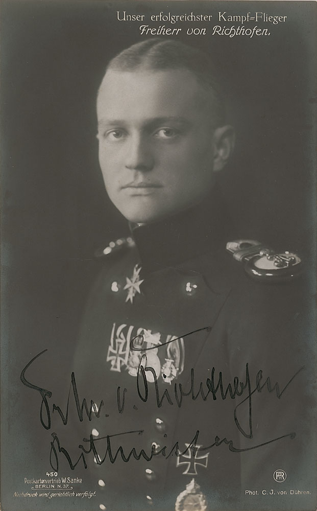 Rare vintage 3.25 x 5.25 von Dühren postcard photo, published by Willi Sanke, of von Richthofen in full military dress, his chest adorned with medals, signed in fountain pen, “Fr[eiherr] M. von Richthofen, Rittmeister.” Just a bit of light signature contrast, as well as scattered light silvering around signature and darker portions of image and background, otherwise fine condition. A very nice example of this most coveted of military and aviation personalities. Pre-certified John Reznikoff/PSA/DNA and RR Auction COA.