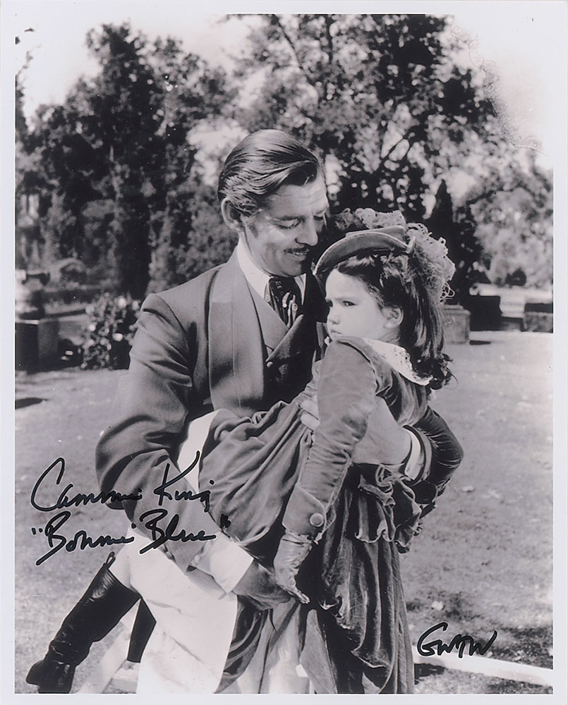 Glossy 8 x 10 photo of King in the arms of Clark Gable, signed in person in black felt tip, “Cammie King ‘Bonnie Blue’ GWTW.” In very fine condition. Originally obtained by in-person specialist Mike Wehrmann. Pre-certified PSA/DNA and RR Auction COA.