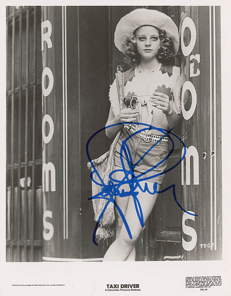 Glossy 8 x 10 Columbia Pictures promotional photo for Taxi Driver, signed in person in blue felt tip. Scattered creases and surface marks and a tear to bottom edge, otherwise fine condition. Originally obtained by in-person specialist Mike Wehrmann. Pre-certified PSA/DNA and RR Auction COA.
