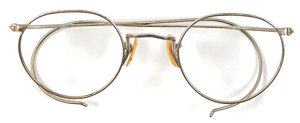 Metal eyeglasses frames without lenses, 5 inches wide, no maker identified. In very good condition, with frames relatively bent but structurally sound. Accompanied by a brown glasses case and cleaning cloth from optometrist Nevile Robinson in London. Provenance: Joey Ramone Estate. Accompanied by a letter of authenticity from the Joey Ramone Estate. RR Auction COA.