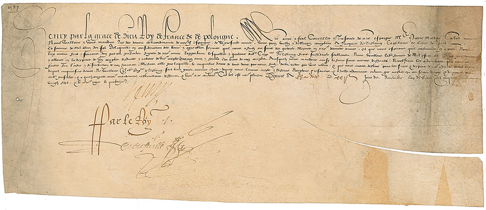 King of France (born 1551), the son of Henry II and Catherine de Medici, who reigned from 1574 until his assassination in 1589. Manuscript DS, in French, signed “Henry,” one page, 17 x 7, no date. Crisply-penned untranslated document, signed at the conclusion by the king and countersigned by two others. A vertical fold, a horizontal separation to blank lower right area, scattered light toning and soiling, and signature a few shades light, but still completely legible, otherwise very good condition. Pre-certified PSA/DNA and RR Auction COA.