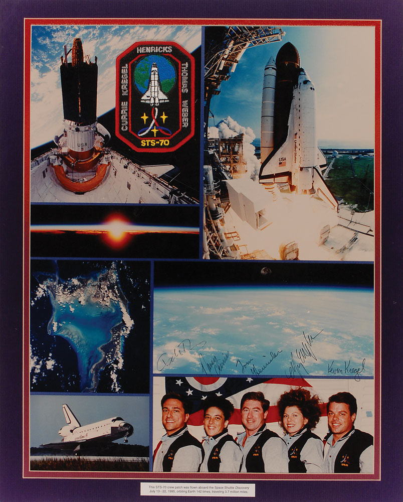 Color glossy 16 x 20 composite photo of the mission, signed in black felt tip by Tom Henricks, Kevin Kregel, Nancy Currie, Don Thomas, and Mary Ellen Weber. A flown mission patch is affixed to the top of the photo, carried on the Discovery from July 13–22, 1995. Photo is affixed to an identical size board, with a small caption affixed to the bottom border. In fine condition, with some scattered light surface marks and dings. Pre-certified Steve Zarelli and RR Auction COA.