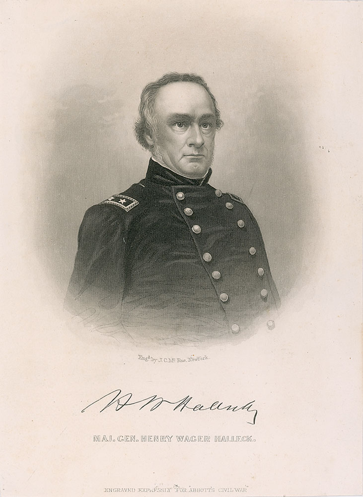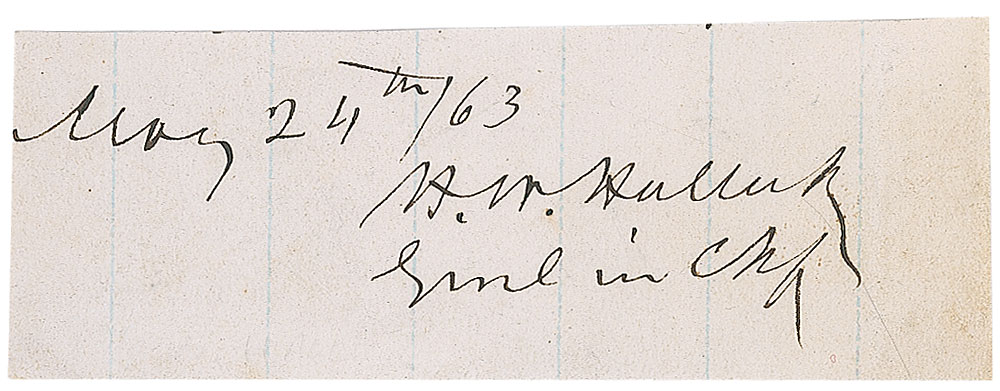 Civil War-dated ink signature, “May 24th/63, H. W. Halleck, Genl. in Chf.,” on an off-white 3.25 x 1.25 lightly-lined slip. In fine condition, with light toning to the right border. Accompanied by an unsigned engraved portrait of Halleck. RRAuction COA.