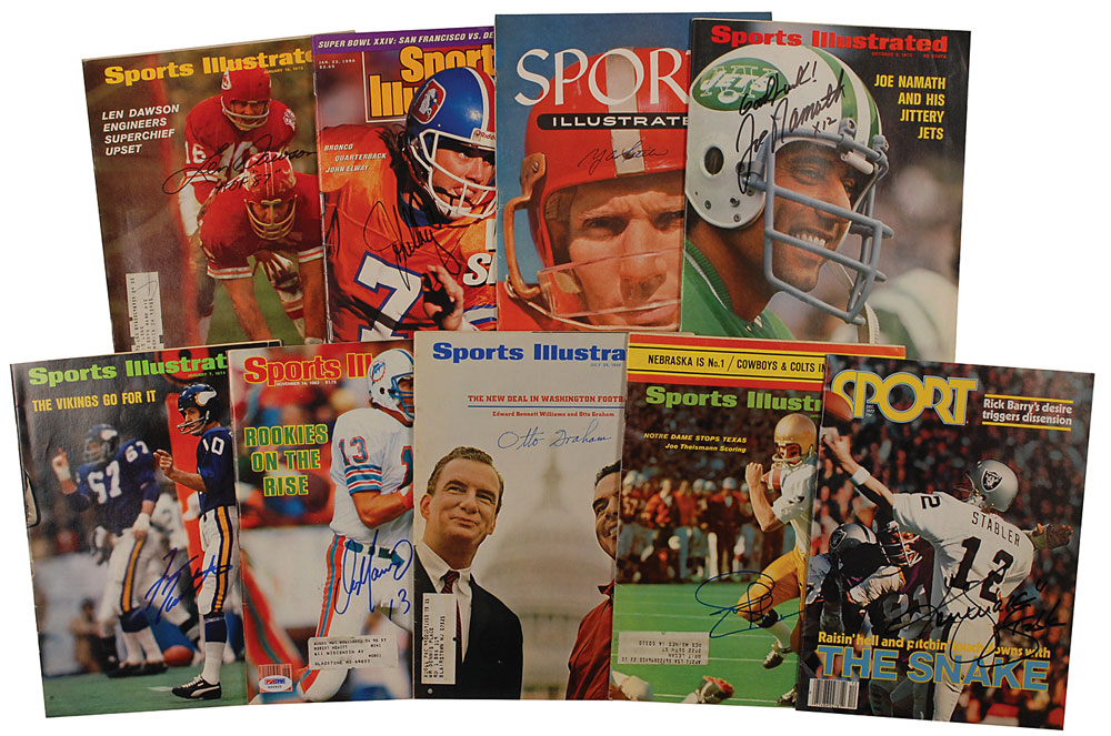 Nine Sports Illustrated and Sport magazines, each signed on the front cover in felt tip by the quarterback pictured. Signers are: Ken Stabler, Dan Marino, Otto Graham, Joe Theismann, Fran Tarkenton, Joe Namath, Y. A. Tittle, John Elway, and Len Dawson. In overall fine condition. RRAuction COA.