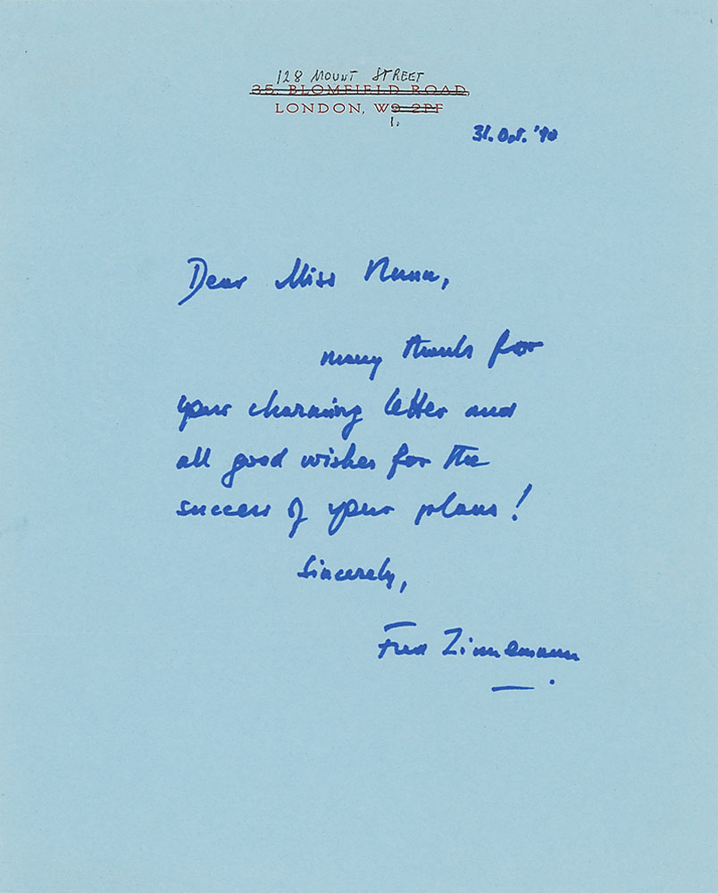 ALS, one page, 8 x 9.75, personal letterhead, October 31, 1990. Brief letter to a woman. In full: “Many thanks for your charming letter and all good wishes for the success of your plans!” Creasing to three corners and a correction to letterhead, otherwise fine condition. Pre-certified PSA/DNA and RR Auction COA.