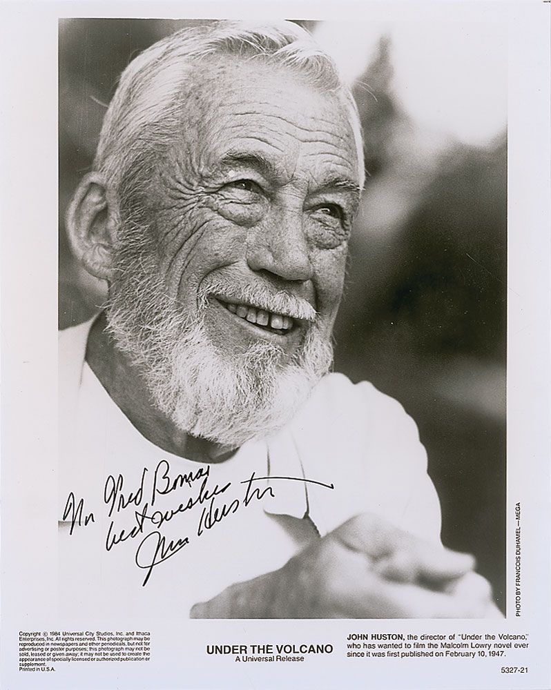Glossy 8 x 10 Warner Bros promotional photo for Under the Volcano, signed and inscribed in black felt tip “For Fred Bomar, best wishes, John Huston.” In fine condition. Pre-certified PSA/DNA and RR Auction COA.