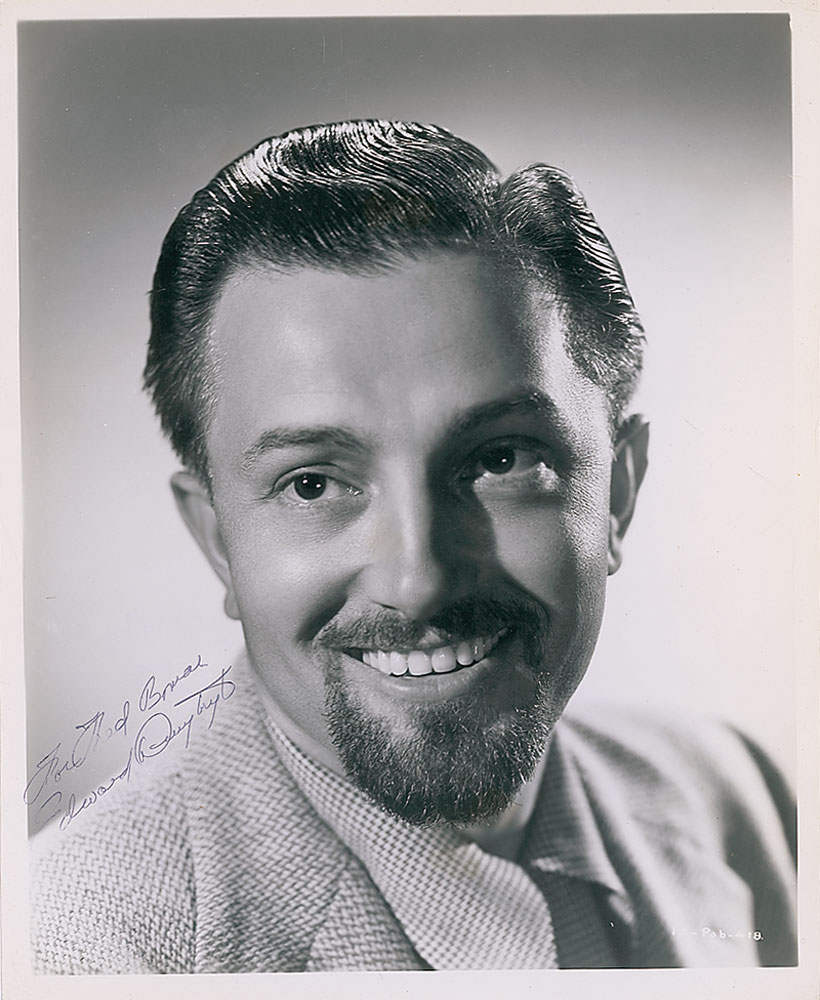 Film director (1908–1999) who was amongst the Hollywood Ten, a group of blacklisted film industry professionals who served time in prison for being in contempt of Congress during the 'red scare' of the late 1940s. Glossy 8 x 10 photo, signed and inscribed in black ballpoint “For Fred Bomar, Edward Dmytryk.” In fine condition, with a few scattered light creases and surface marks. Pre-certified PSA/DNA and RR Auction COA.