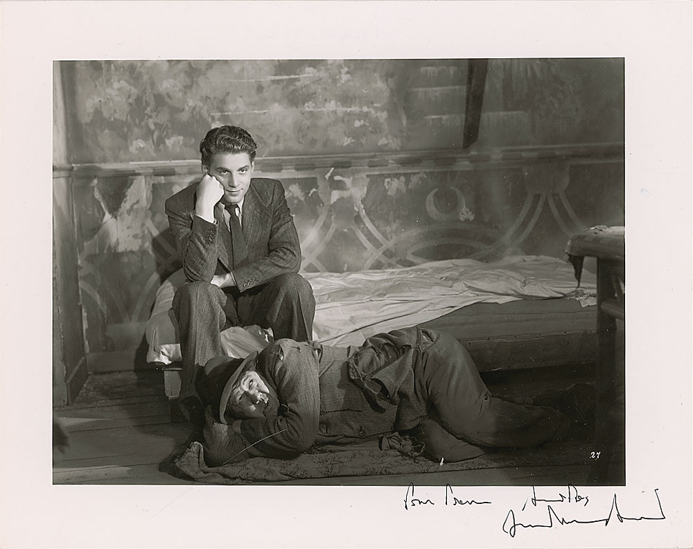 Glossy 10 x 8 photo of a young Aumont sitting on the edge of a bed, signed and inscribed in person in black ink to Pierre. In fine condition, with a couple edge creases and a slight brush to small part of signature and inscription. Pre-certified PSA/DNA and RR Auction COA.