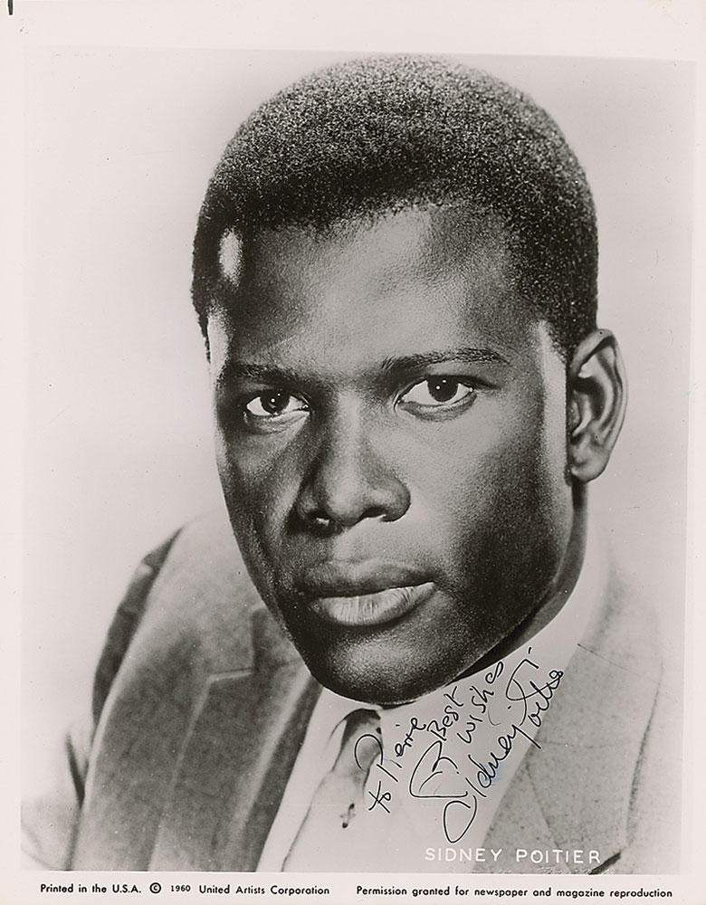 Glossy 8 x 10 United Artists publicity photo, signed and inscribed in person in black ink, “To Pierre, Best wishes, Sidney Poitier.” In fine condition, with some light brushing to portions of signature and inscription. Pre-certified PSA/DNA and RR Auction COA.