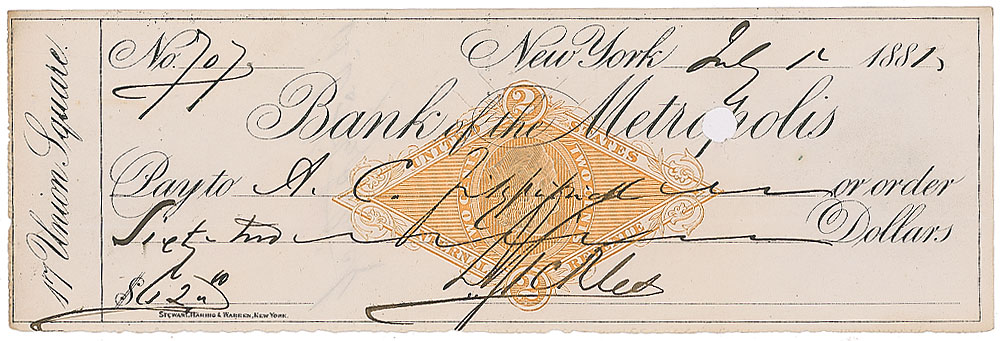 Bank check, 8 x 2.5, filled out and signed by Sickles, “D. Sickles,” payable to A. C. Fitzpatrick for $62.00, July 1, 1881. In fine condition, with punch hole and cancellation cut to body, rough bottom edge, and a bit of light toning. RR Auction COA.