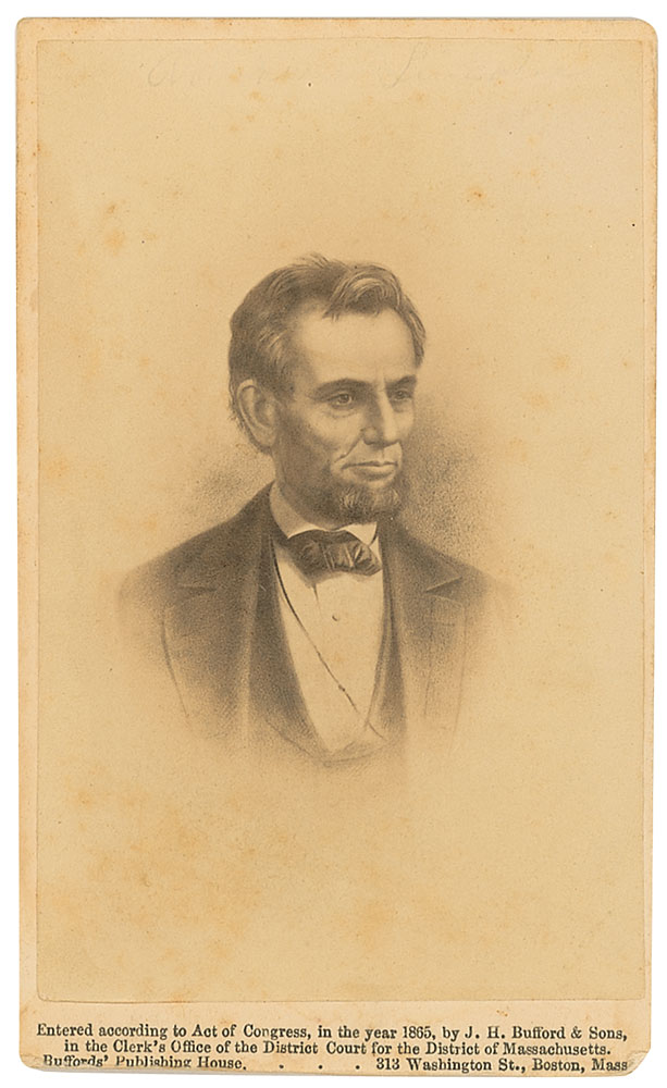 Unsigned original 2.5 x 4 carte-de-visite illustrated bust portrait of Lincoln, by J. H. Bufford & Sons of Boston circa 1865. Scattered foxing to the image and a lightly trimmed bottom edge, otherwise fine condition. RR Auction COA.