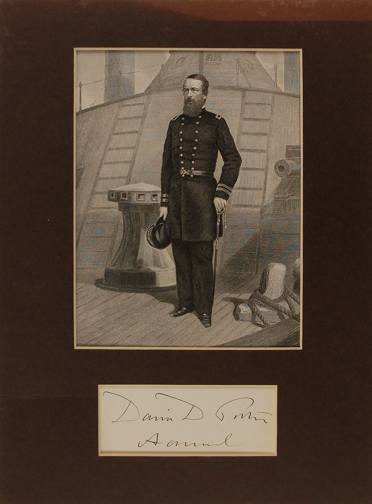 Admiral (1813–1891) who helped improve the Navy as the Superintendent of the US Naval Academy after significant service in the American Civil War. Ink signature, “David G. Porter, Admiral,” on an off-white card. Matted with an engraved portrait to an overall size of 9 x 12. In fine condition, with some toning to top of mat. RRAuction COA.