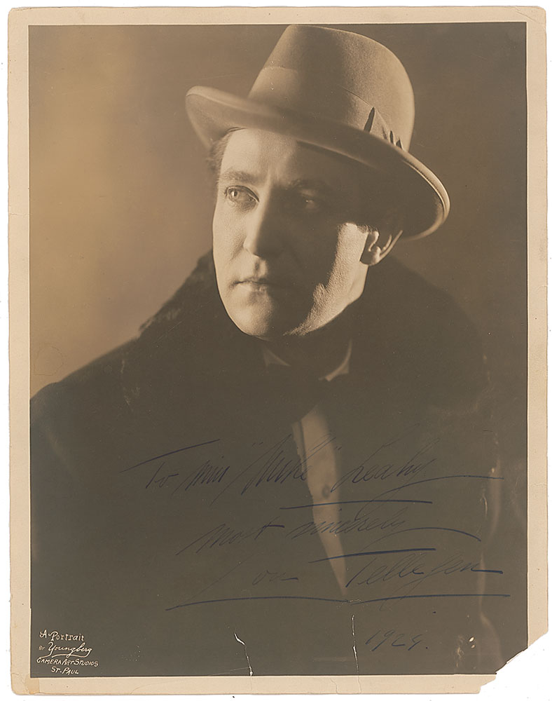 Silent film actor (1881–1934) who appeared in many films with Sarah Bernhardt. Ill and debt-ridden, he committed suicide by stabbing himself with a pair of sewing scissors seven times. Vintage matte-finish 11 x 14 photo by Youngberg of St. Paul, signed and inscribed in fountain pen, “To Miss ‘Mike’ Leahy, most sincerely, Lou Tellegen, 1924.” Light scattered creases, multiple tears to edges, and paper loss to lower right corner, otherwise very good condition. Pre-certified PSA/DNA and RR Auction COA.