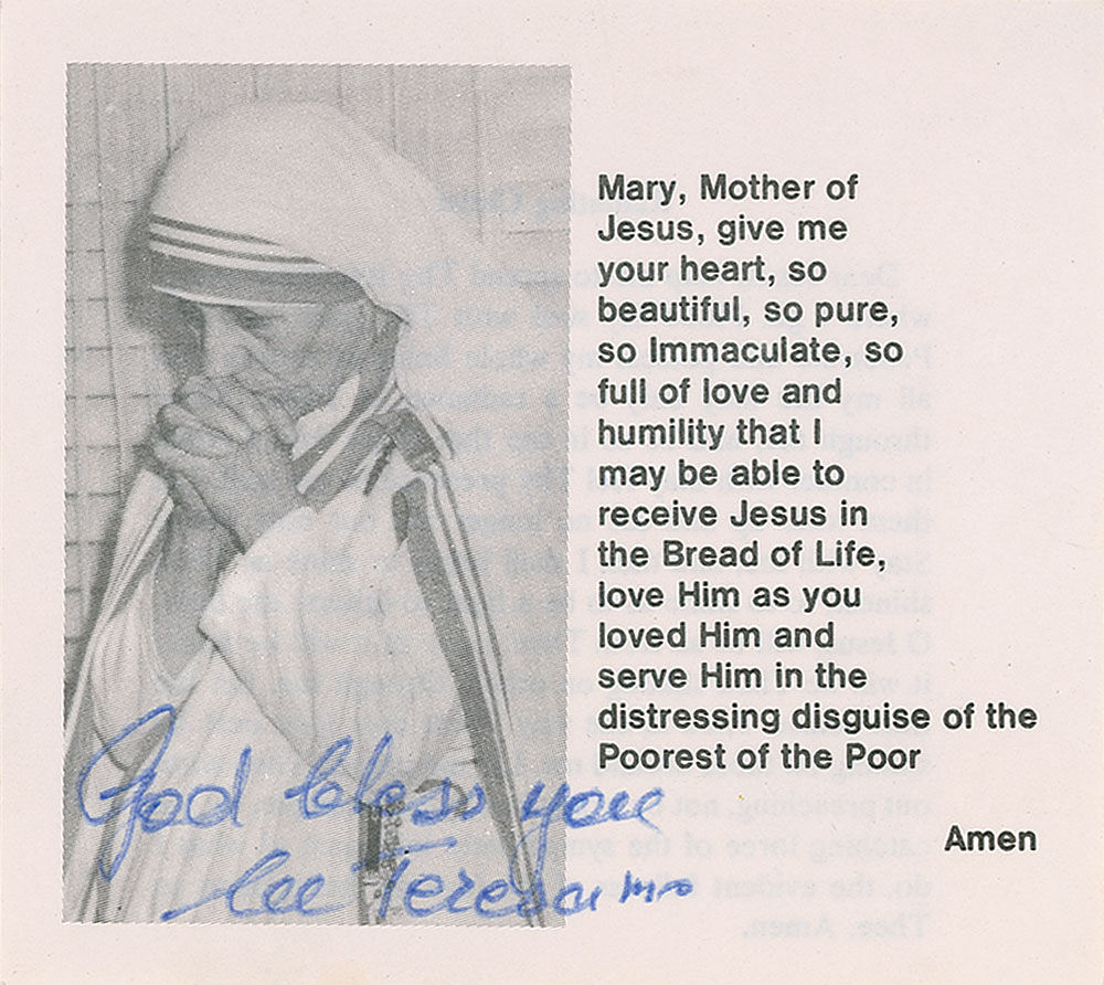 Printed prayer slip, 4.25 x 5.5, with an image of Mother Teresa with her hands clasped in prayer, signed at the bottom in blue felt tip, “God bless you, M Teresa mc.” In fine condition. RRAuction COA.