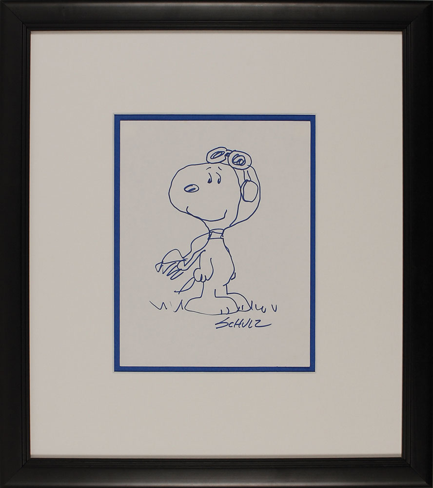 Original signed felt tip sketch of Snoopy as the World War I flying ace, his scarf fluttering slightly in the breeze, on an off-white 8.5 x 11.25 sheet, signed at the bottom, “Schulz.” Matted and framed to an overall size of 19.5 x 22. In fine condition. Pre-certified PSA/DNA and RR Auction COA.