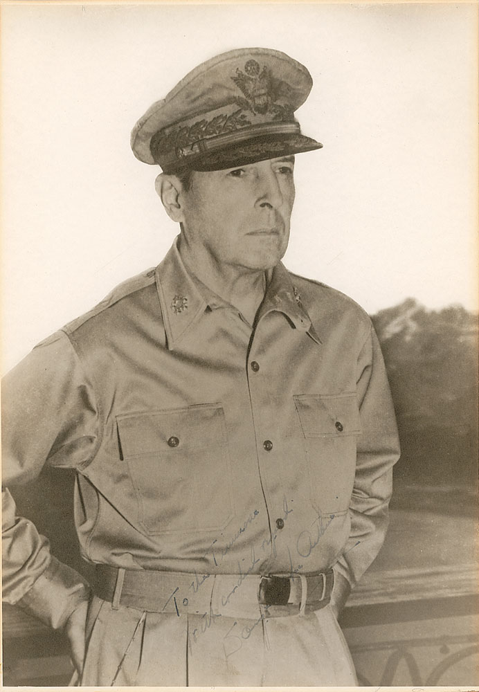 Commanding vintage matte-finish 9 x 13 photo of MacArthur, signed and inscribed in fountain pen, “To Mr. Timmons, with cordial regard, Douglas MacArthur.” Affixed to a slightly larger mount. Lightly trimmed edges, and the inscription and signature faded but legible, otherwise fine condition. Pre-certified PSA/DNA and RR Auction COA.