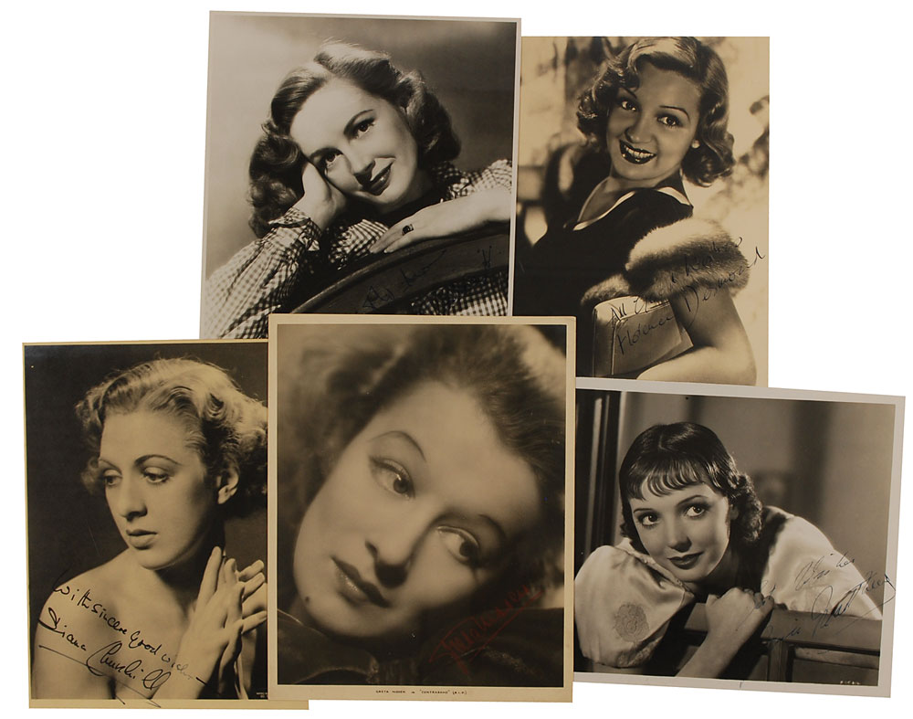 Five signed vintage glossy and matte-finish photos, various sizes, each signed in fountain pen or artist’s pencil by the actress pictured. Signers are: Diana Churchill, Greta Nissen, Florence Desmond, Phyllis Calvert, and Jessie Matthews. In overall very good to fine condition. RRAuction COA.