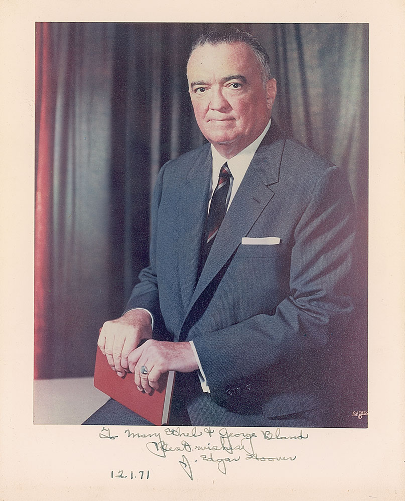 Color satin-finish 6.5 x 8 photo of Hoover affixed to an 8 x 10 mount, signed and inscribed on the mount in fountain pen, “To Mary Ethel & George Bland, Best wishes, J. Edgar Hoover, 12.1.71.” Light toning and trimmed edges to mount, otherwise fine condition. RRAuction COA.