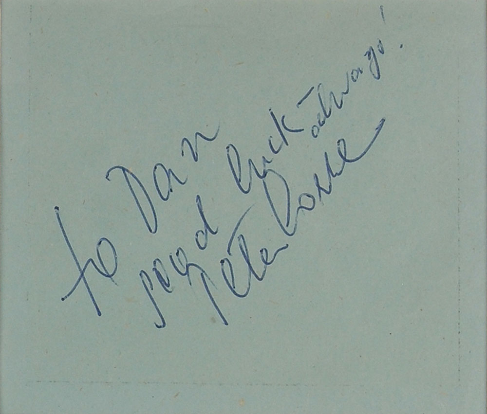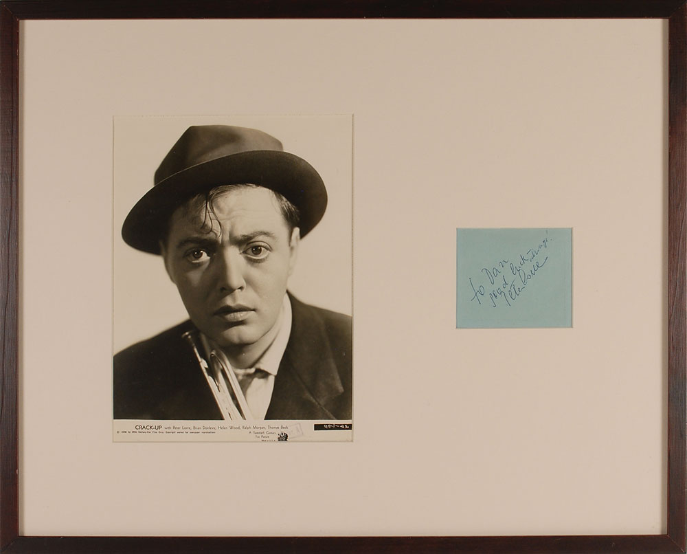 Vintage ballpoint signature and inscription, “To Dan, good luck—always! Peter Lorre,” on a blue 3.5 x 3 album page. Matted and framed with an unsigned original publicity photo of Lorre to an overall size of 21 x 17. In fine condition, with some trivial foxing and toning. Pre-certified PSA/DNA and RR Auction COA.
