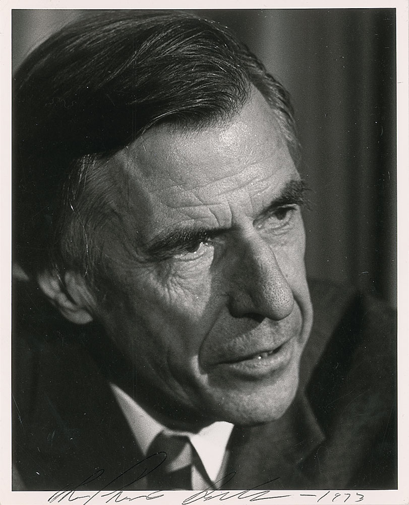 Glossy 8 x 10 close-up photo, signed in the lower border in black ballpoint, “John Kenneth Galbraith—1973.” A few light bends and creases, and some light contrast to parts of the signature, otherwise fine condition. RRAuction COA.
