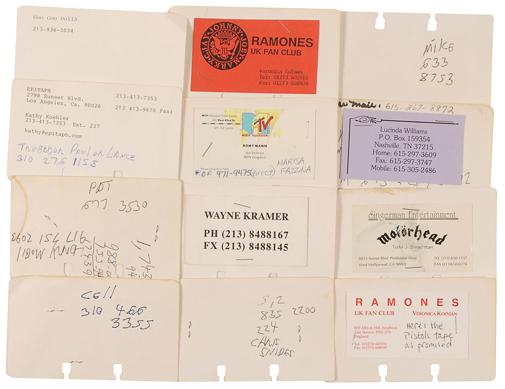 Joey Ramone’s personal Rolodex, 5.5 x 3.5 x 10, consisting of numerous cards bearing typed addresses or stapled business cards of Ramone’s associates. Some interesting business cards include Ramone’s personal Addicted to Noise card, Arista Records, Rock 'n' Roll High School producer Allan Arkush, Epitaph Records, EMI Records, Footlight Records, Geffen Records, rock ‘n’ roll photographer Bob Gruen, Instinct Records, Wayne Kramer, Lucinda Williams, MCA Records, a few different people at MTV, Rip magazine, the Ramones UK Fan Club, Spin Records, Motorhead’s agent, and a few different radio stations, including K-Rock. Typed phone number and address cards for the Bottom Line venue, a CBGB booking agent, Stan Lee of the Dickies, the Goo Goo Dolls, and Sire Records are included. Epitaph Records and Lucinda Williams cards both bear ballpoint notations in Ramone’s hand. Five cards also have phone numbers and other notations to the reverse in Ramone’s hand. His rolodex also reveals an affinity for fine Japanese cuisine. Expected wear from use, including creases to corner tips and letter tabs, otherwise fine condition. Provenance: Joey Ramone Estate. Accompanied by a letter of authenticity from the Joey Ramone Estate. RR Auction COA.