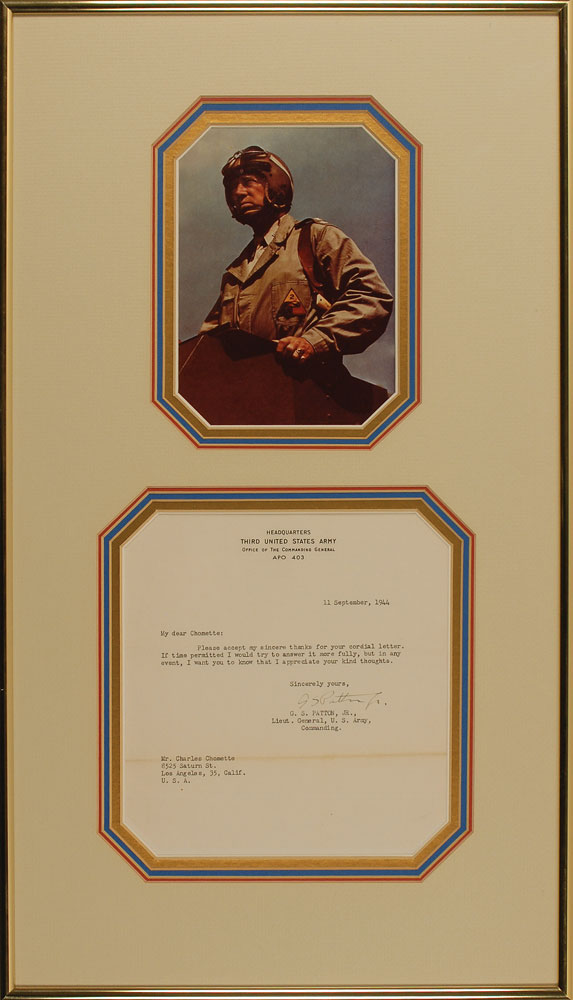 War-dated TLS signed “G. S. Patton, Jr,” one page, 7.25 x 8, Headquarters Third United States Army letterhead, September 11, 1944. Brief letter of thanks. In full: “Please accept my sincere thanks for your cordial letter. If time permitted I would try to answer it more fully, but in any event, I want you to know that I appreciate your kind thoughts.” Quadruple-matted and framed with a color portrait of Patton in his tank helmet, to an overall size of 13 x 23. In fine condition, with some mild toning along one of the horizontal mailing folds. Pre-certified John Reznikoff/PSA/DNA and RR Auction COA.
