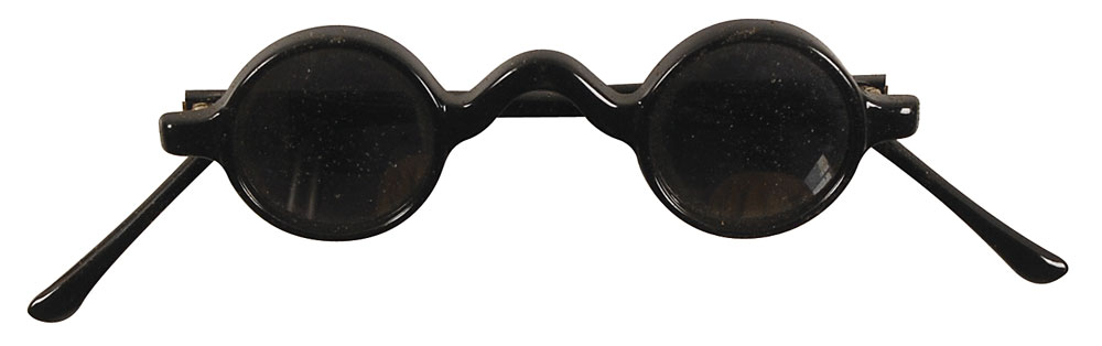 Tiny black plastic-framed sunglasses with mirrored circular lenses, 4.5 inches wide, identified inside the right earpiece, “S:22 Korea.” In fine condition, with the frame slightly bent. Accompanied by a broken brown plastic glasses case. Provenance: Joey Ramone Estate. Accompanied by a letter of authenticity from the Joey Ramone Estate. RR Auction COA.