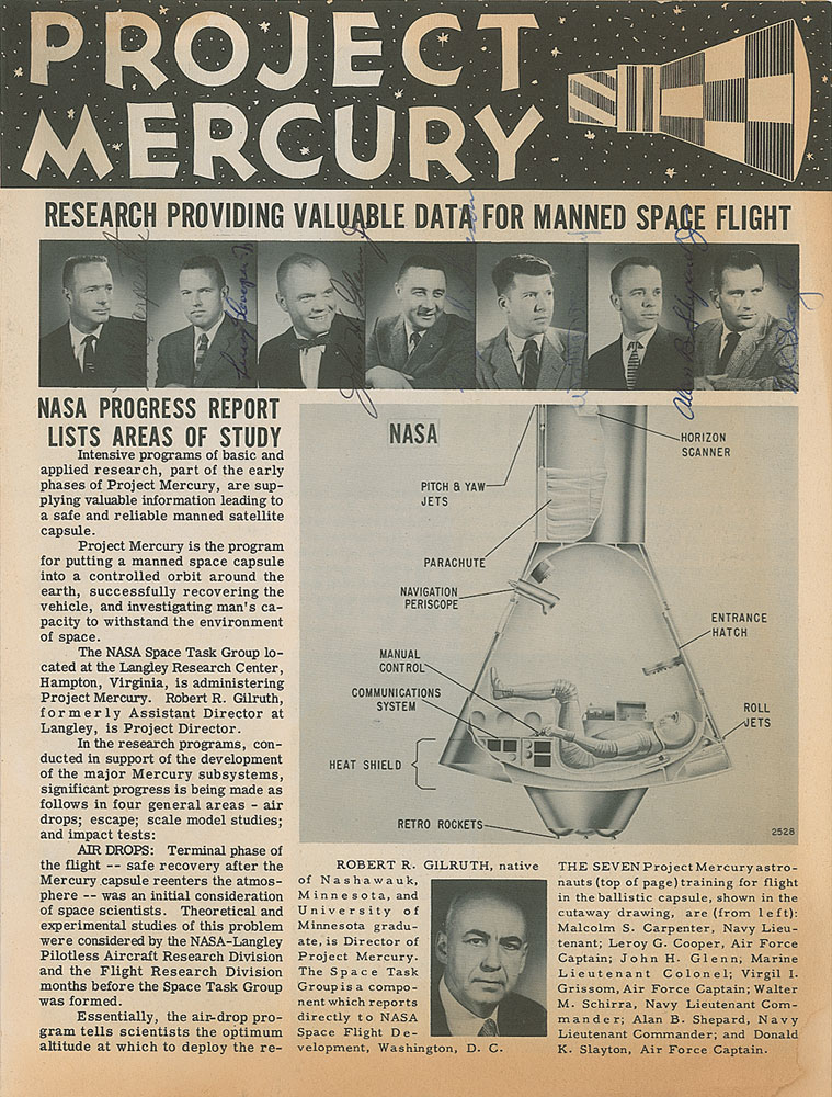 Fantastic original vintage 1959 NASA newsletter detailing progress on the Mercury program, four pages, 8 x 10.5, vertically signed in ballpoint on the front page by all seven original Mercury astronauts, each next to his photo, and all signing with their less common ‘formal’ signatures: “Scott Carpenter,” “Leroy G. Cooper, Jr.,” “John H. Glenn, Jr.,” “Virgil I. Grissom,” “Walter M. Schirra,” “Alan B. Shepard, Jr.,” and “D. K. Slayton.” The content includes articles and photos on safety tests, water drops, re-entry for ground and water landing, and more. Some mild toning, mostly to bottom of page, and light to moderate contrast to the signatures, otherwise fine condition. Pre-certified Steve Zarelli and RR Auction COA.