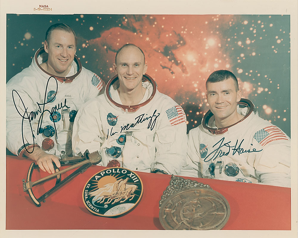 Color 10 x 8 NASA ‘red-numbered’ photo of the original Apollo 13 crew in their space suits and posing with the mission’s emblem, signed in black felt tip by James Lovell, Ken Mattingly, and Fred Haise. In fine condition. Pre-certified Steve Zarelli and RR Auction COA.