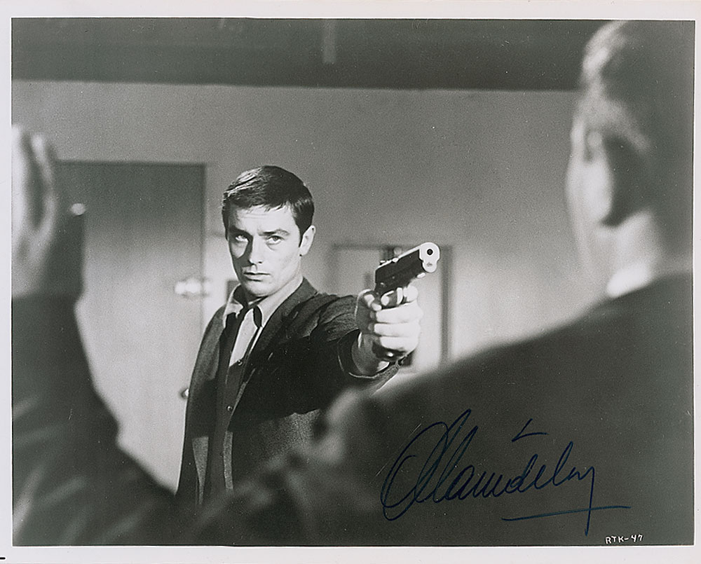Glossy 10 x 8 photo of Delon wielding a pistol in the 1965 film L’Insoumis, signed in black felt tip. In fine condition, with some scattered light surface marks and impressions. Consignor notes signature was obtained at the Everyman Theatre in London in the late 1980s. Pre-certified PSA/DNA and RR Auction COA.