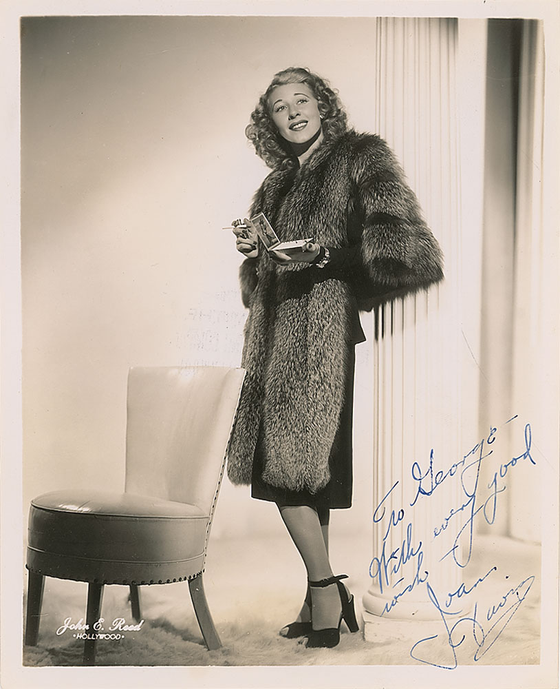 Vintage glossy 8 x 10 photo of Davis in a fur coat holding a cigarette, signed and inscribed in fountain pen “To George—With every good wish—Joan Davis.” Some light surface marks and creases and a bit of irregular ink adhesion to small portions of signature and inscription, otherwise fine condition. Pre-certified PSA/DNA and RR Auction COA.