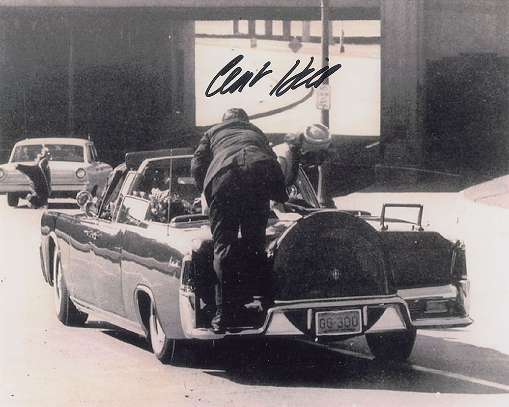 Satin-finish 10 x 8 photo of Hill leaping onto Kennedy’s limousine after he was shot, signed in black felt tip. In very fine condition. RR Auction COA.