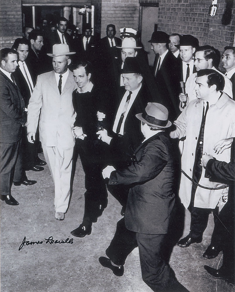 Satin-finish 8 x 10 photo of Leavelle escorting Lee Harvey Oswald moments before Jack Ruby shot him, signed in the lower left in black felt tip. In fine condition. RR Auction COA.