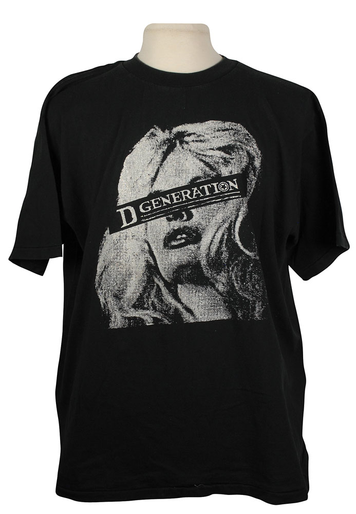 Joey Ramone’s stage-worn t-shirt. Black t-shirt, size XL by All Sport, is for the band D Generation and bears their logo over a shimmering image of a woman. In fine condition, with expected wear. Accompanied by three photos of Joey wearing the shirt, including one of him wearing it on stage and one of him with Ronnie Spector. Provenance: Joey Ramone Estate. Accompanied by a letter of authenticity from the Joey Ramone Estate. RR Auction COA.