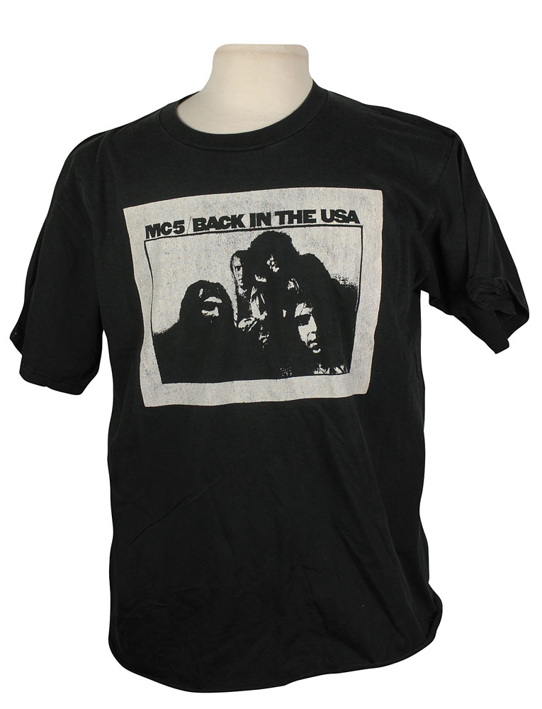 Joey Ramone’s personally owned and worn t-shirt. Black t-shirt, size XL by Jerzees, is for the band MC5 and bears an image of their Back in the USA album cover. In fine condition, with expected wear. Accompanied by four photos of Joey wearing the shirt. Provenance: Joey Ramone Estate. Accompanied by a letter of authenticity from the Joey Ramone Estate. RR Auction COA.