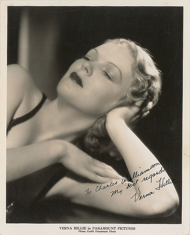 Gorgeous glossy 8 x 10 Paramount Pictures publicity photo, signed and inscribed in black felt tip, “To Charles Williamson, My best regards, Verna Hillie.” Light creases to borders and corners, and a small tear to right border, otherwise fine condition. Pre-certified PSA/DNA and RR Auction COA.