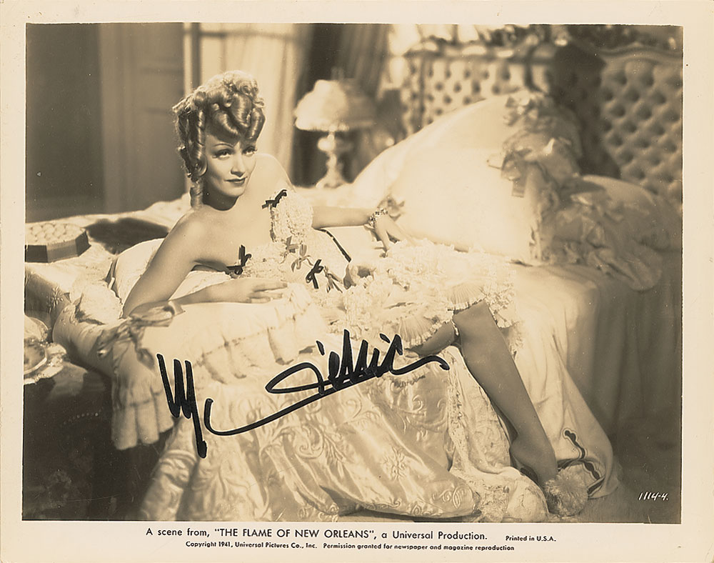 Attractive glossy 10 x 8 promotional photo of Dietrich in The Flame of New Orleans, signed in black felt tip. In fine condition, with a few mild surface creases. Pre-certified PSA/DNA and RR Auction COA.