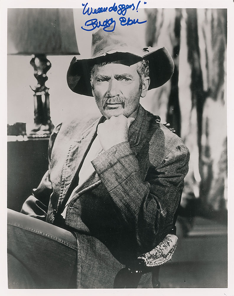 Glossy 8 x 10 photo of Ebsen from The Beverly Hillbillies, signed in blue felt tip, “‘Weeeee doggies!’ Buddy Ebsen.” In very fine condition. Pre-certified PSA/DNA and RR Auction COA.