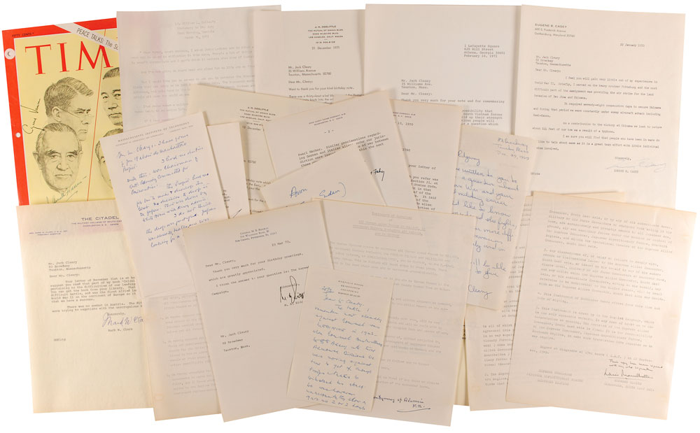 Eighteen items, including letters, souvenir typescripts, and a magazine cover, each signed by a notable military figure. Signers include: Montgomery of Alamein, Mountbatten of Burma, James H. Doolittle (2), Dean Rusk, Eugene B. Casey, Charles Fahy, Mark W. Clark, Anthony Eden, L. Moore Cosgrove, L. L. Lemnitzer, James M. Gavin, William L. Calley, Matthew B. Ridgway, Cyrus Vance, Jerome C. Hunsaker, and Averell Harriman. Letters contain excellent war content throughout, including Rusk’s thoughts on Vietnam, Doolittle commenting on his raid, and Hunsaker’s opposition to the atomic bomb. In overall fine condition, with various scattered folds, creases, and toning. Many accompanied by their original mailing envelopes. RR Auction COA.