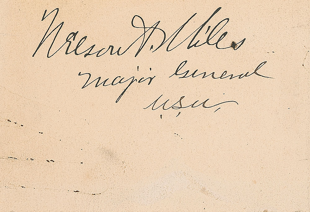 American soldier (1839–1925) who earned a niche in military history as the only man to serve as an officer in the Civil War, Indian Wars, and Spanish-American War. Miles was wounded four times during the Civil War, receiving the Medal of Honor for his gallantry at the Battle of Chancellorsville. He played a leading role in nearly all of the army's campaigns against the American Indian tribes of the Great Plains. Ink signature, “Nelson A. Miles, Major General, U.S.A.,” on an off-white 3 x 2 slip affixed to a slightly larger slip. Rusty paperclip marks to lower left and a bit of scattered light soiling, otherwise fine condition. Accompanied by an original unsigned 4 x 6.25 cabinet photo of Miles by Bogardus of New York. Portrait has some bends and spots, as well as light silvering. RR Auction COA.